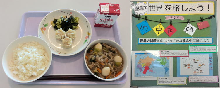 本校の給食では、「給食で世界を旅しよう」をテーマに、年間を通してさまざまな国や地域の料理を取り入れた「国際献立」を提供しています。これまでにも、英語の授業と連携したり、海外にルーツを持つ生徒と協力したりしながら、食を通して世界の文化に触れる取り組みを行ってきました。今年度最後の「国際献立」は、来年度に予定している「アジパラ(アジアパラ競技大会)献立」の先駆けとして、中国の料理を取り上げます。中国には「四大料理」と呼ばれる代表的な料理文化がありますが、今回はその中から「広東料理」を選びました。広東料理は、しゅうまいなどのあっさりとした味付けが特徴です。また、肉まんやごま団子などの点心と中国茶を一緒に楽しむ「飲茶」の文化も広く知られています。3月10日(火)には「四川料理」を提供する予定です。