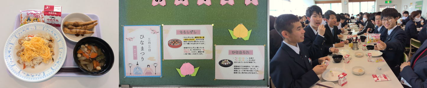 3月3日は、女の子の健やかな成長と幸せを願い、お祝いをする「ひなまつり」です。「桃の節句」とも呼び、桃の花やひな人形を飾る風習があります。「ひなまつり」に食べられている行事食の「ちらし寿司」には、先が見通せて縁起が良いと言われている「れんこん」を使いました。また、給食の「ひなあられ」は、春の風情を表す色が使われていて、白色(雪解けの大地)、緑色(草木)、桃色(桜)の意味があると給食の時間の指導を行いました。他にも、地域ごとに食べられているひな菓子があり、愛知県は「いがまんじゅう」や「おこしもの」などがあります。