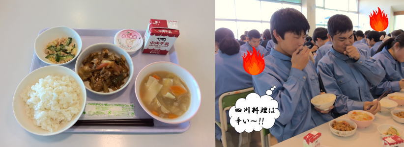 中国には「四大料理」と呼ばれる代表的な料理文化があります。前回紹介した「広東料理」は、あっさりとした味付けが特徴でしたが、今回は“辛さ”が特徴の「四川(しせん)料理」について取り上げます。四川地方は、夏は蒸し暑く、冬は寒さが厳しいことから、食欲を高め、身体を温めるために、辛味や香辛料を活かした料理が発達してきました。給食では、四川料理を代表する「回鍋肉(ホイコーロー)」と「棒棒鶏(バンバンジー)」を提供しました。生徒からは、「辛くておいしい!」「中華料理好きです」などの声がありました。広東料理とは異なる味わいを通して、中国の食文化の豊かさを感じてほしいと思います。